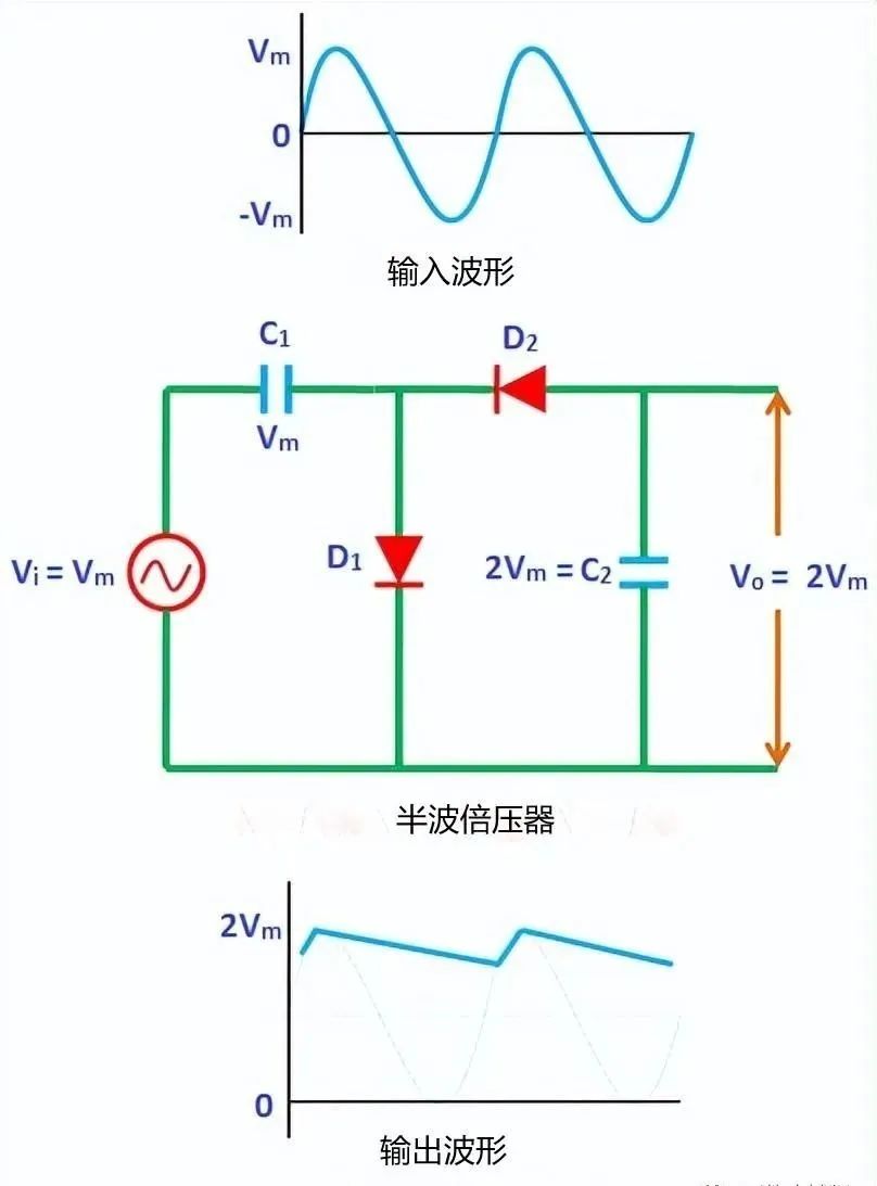因此,在负半周期间,电容 C2 由输入电源电压 Vm 和电容 C1 电压 Vm 充电。因此,电容 C2 被充电至 2m。