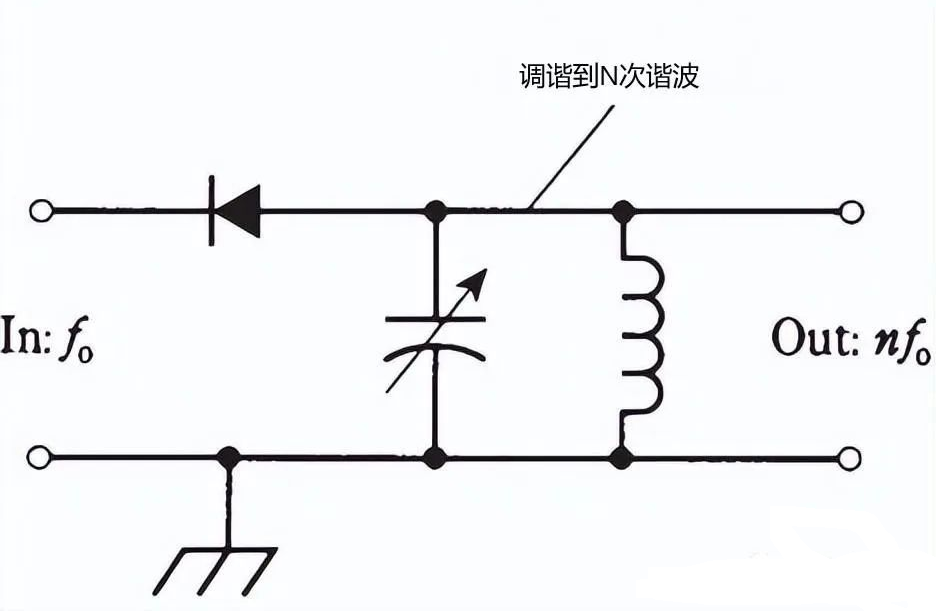 二极管非常适合这一点,一个简单的倍频电路如图所示,输出 LC 电路被调谐到所需的第 n 次谐波频率 nfo,而不是输入或基频 fo。为了使二极管用作倍频器,必须是在相同频率下也能很好地用作检测器的类型。这意味着该组件应充当整流器,而不是电容。