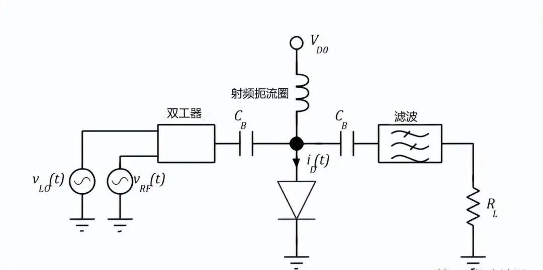 二极管偏置在直流电压 ,通过隔直电容 与 RF 和 LO 信号路径去耦。RF 扼流圈阻止 RF/LO 信号进入偏置源。由于二极管非线性而产生的高频分量被中频滤波器滤除,只允许中频分量出现在输出端。