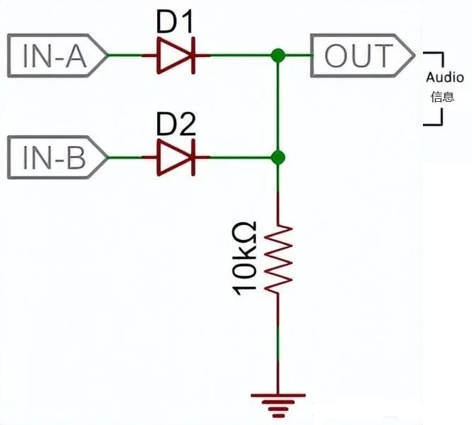 例如,一个二极管双输入或门可以由两个具有共享阴极节点的二极管构成。逻辑电路的输出也位于该节点。每当任一输入(或两者)为逻辑 1(高/5V)时,输出也变为逻辑 1。当两个输入均为逻辑 0(低/0V)时,输出通过电阻拉低。