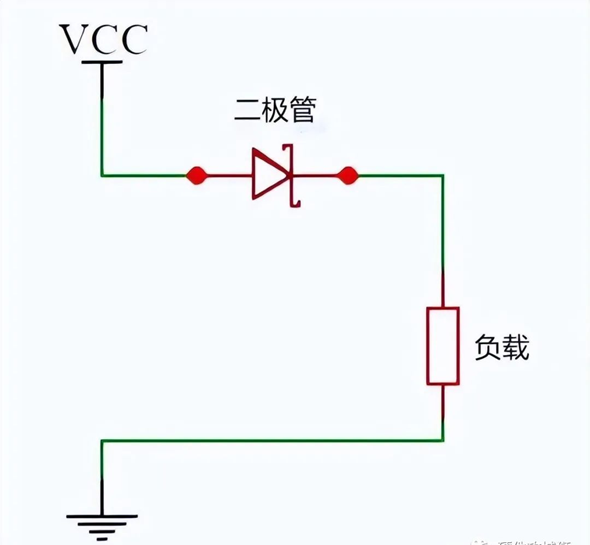 当 Vcc 和地以正确的极性连接时,二极管正向传导,负载接收功率。与整流二极管的 0.7V 相比,肖基特二极管上的正向压降在 0.04V 左右非常少,这样二极管上的功率损耗不会太大,而且肖特基二极管可以允许更多的电流通过它,还具有更快的开关速度,因此可以用于高频电路。