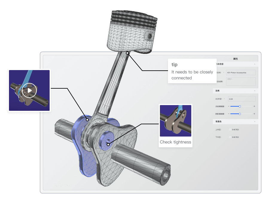 读取CAD外观和结构数据:3D 说明书应用能够读取 CAD 外观和结构数据,根据用户需求,还可以获取 CAD 属性数据,能够自动解析和转换CAD文件,将其转换为高质量的3D数字说明书。同时,我们的应用还支持多种格式的CAD文件,例如STL、STEP、IGES等,以满足不同客户的需求。