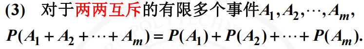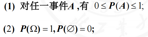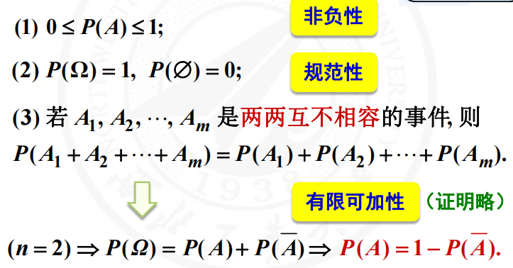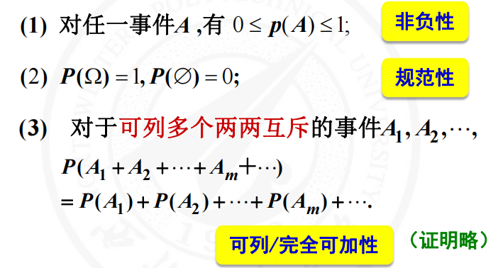 - 若P(A)满足下列三条公理,则称P(A)为事件A的概率