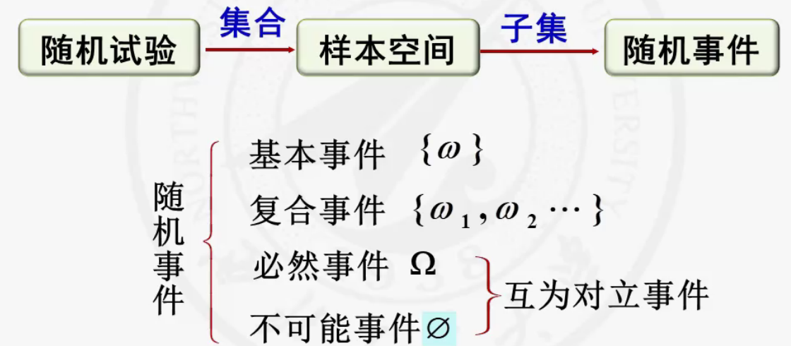 - 随机试验E的样本空间Ω的子集称为E的随机事件