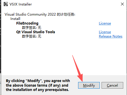 右上角关闭VS,自动弹出拓展模块安装,点击 Modify 即可