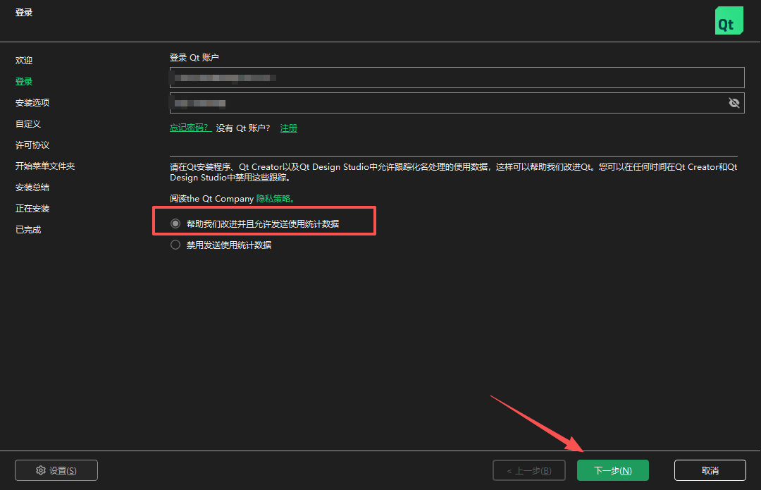 账号需要在QT官网注册,上面有QT官网链接,(作者这里就省略注册步骤了,大概流程:个人邮箱->填写资料->选择地区->邮箱验证),输入账号后点击下一步