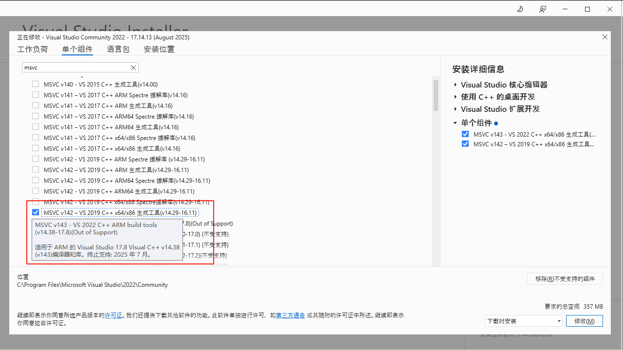 注意VS这里选择的MSVC 2019 X64与后面QT在线安装器的MSVC 2019 x64是对应的