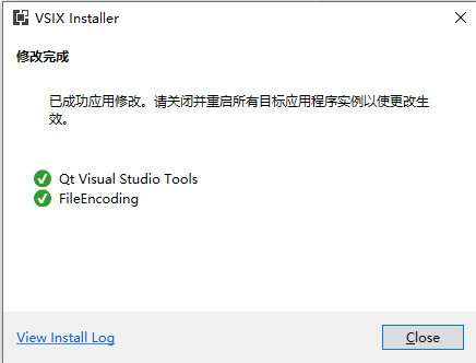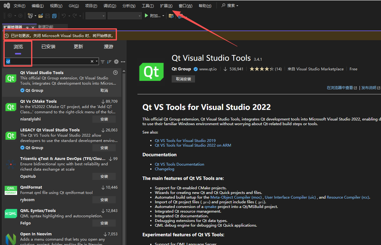 安装VS的QT拓展插件:拓展->管理拓展,浏览中搜索qt,安装Qt Visual Studio Tools,出现"已计划更改。关闭Microsoft Visual Studio 时。将开始安装",说明下载完成