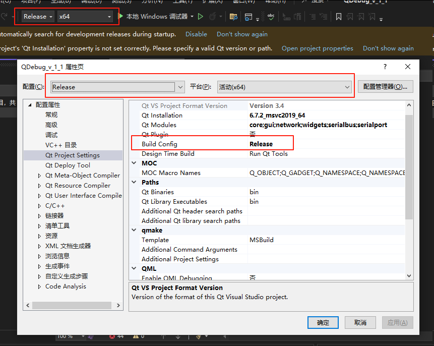 1、将Debug换成Release,右击项目->属性中Release的模块,需要调整为与Debug的模块一致,然后运行程序,生成exe可执行程序