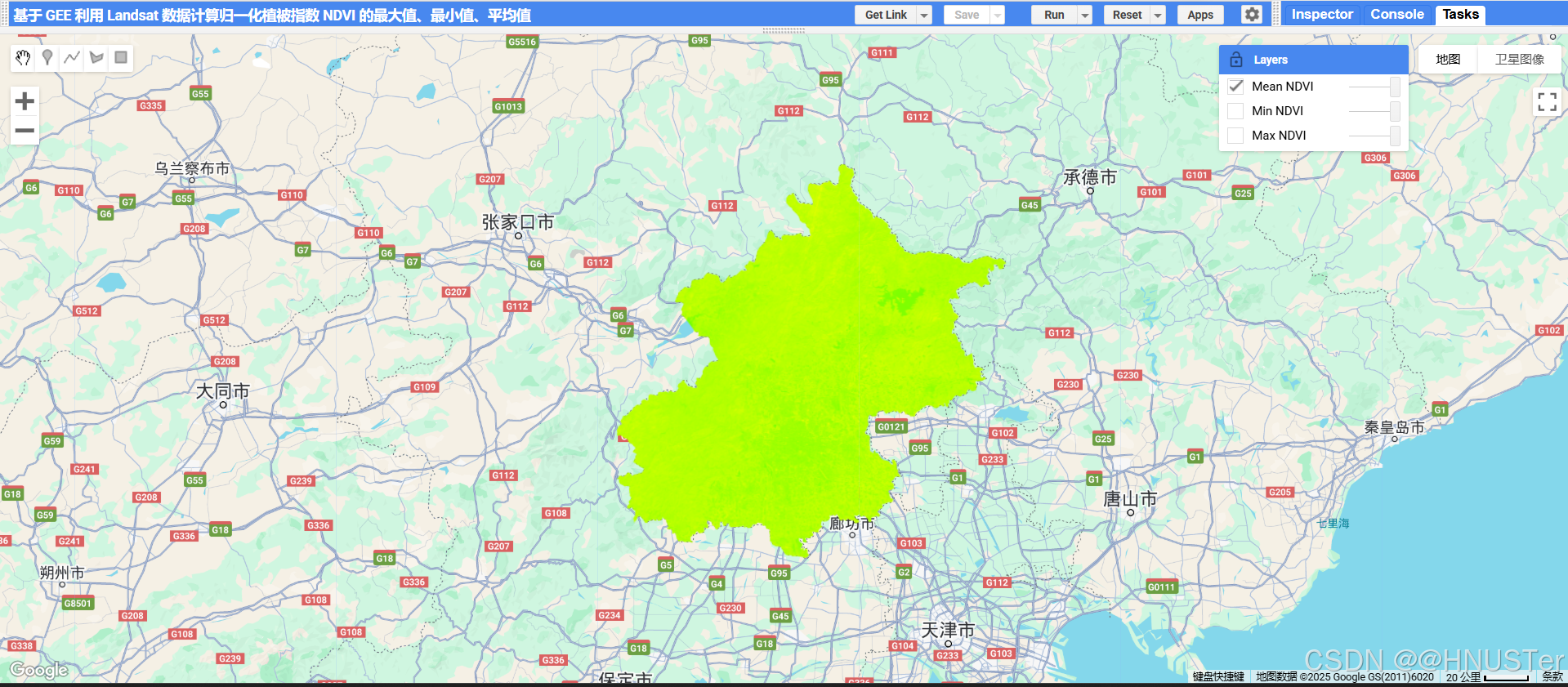 landsatCollection.mean()是 GEE 的简化聚合方法,直接对影像集合中每个像元的 NDVI 值计算算术平均值,得到年度平均 NDVI 影像。- 意义:平均 NDVI 可整体反映研究区域 2020 年植被的平均覆盖水平和生长状况,是衡量区域植被状况的常用指标。