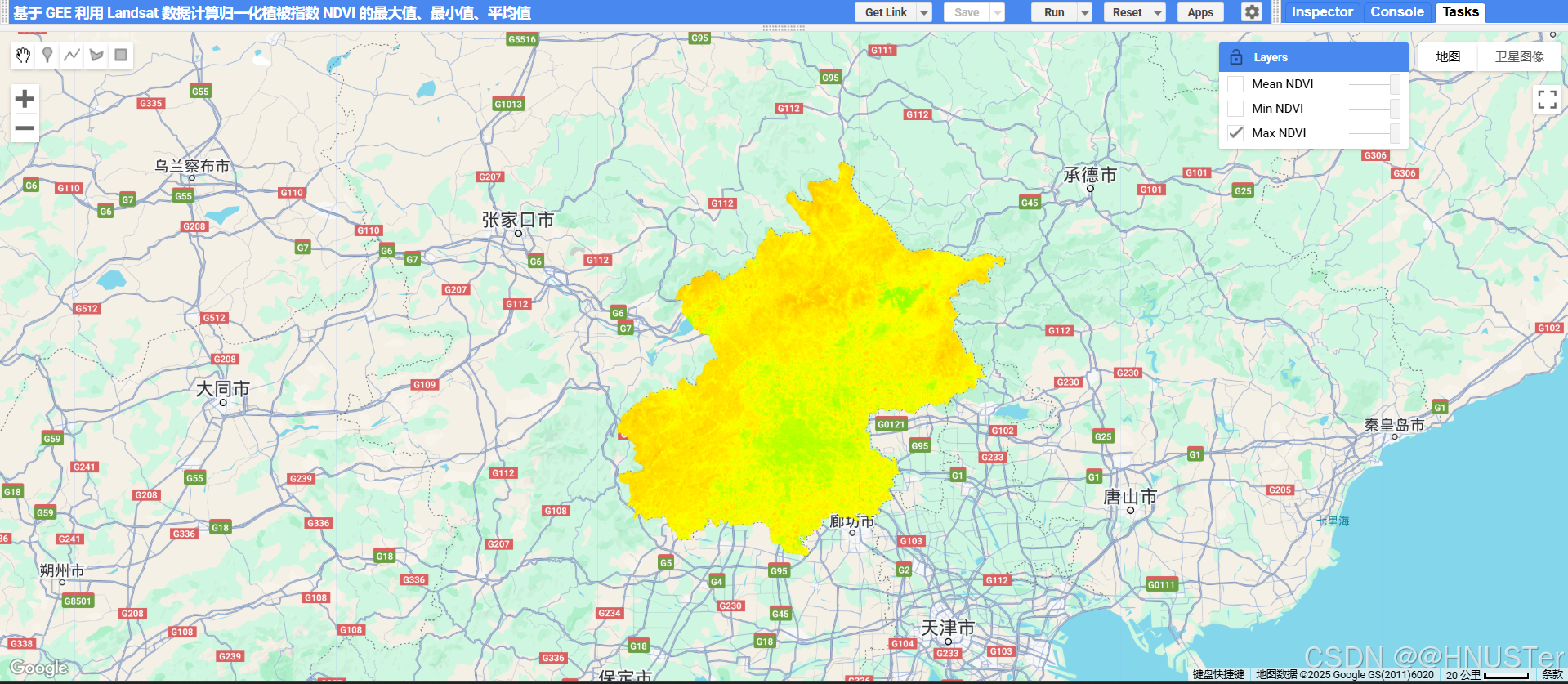 min: -1, max: 1设定 NDVI 值的显示范围(与 NDVI 理论取值范围一致),palette定义颜色映射方案,此处 “0000ff”(蓝色)代表低 NDVI 值(如水体、裸地),“00ff00”(绿色)代表中等 NDVI 值(植被),“ffff00”(黄色)、“ff0000”(红色)代表较高 NDVI 值(茂密植被); - 第三个参数是图层名称(如 “Max NDVI”),用于在地图图层控制栏中识别不同图层。