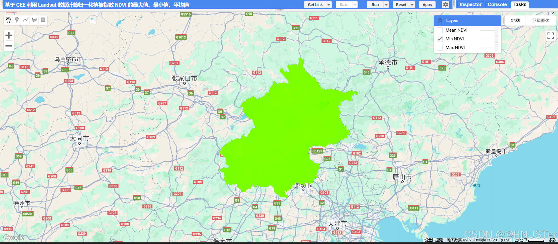 landsatCollection.reduce(ee.Reducer.min())中,reduce方法用于对影像集合进行聚合运算,ee.Reducer.min()是最小值聚合器,会对每个像元在 2020 年所有影像中的 NDVI 值取最小值,生成年度最小 NDVI 影像。- 意义:最小 NDVI 可反映植被生长最稀疏或非生长季的植被覆盖状况,也可用于识别水体、裸地等非植被区域(NDVI 值通常接近 - 1 或 0)。