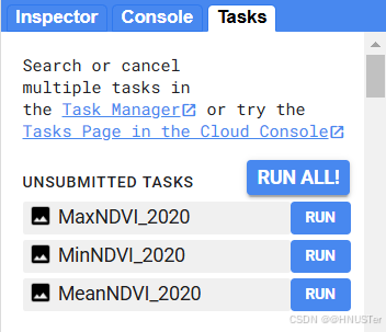 image:指定待导出的影像(如maxNDVIClipped);description:导出文件的名称(如 “MaxNDVI_2020”),便于在 Drive 中识别;scale:导出影像的空间分辨率,单位为米,此处 “30” 对应 Landsat 8 的原始空间分辨率(30 米),确保导出数据精度与原始影像一致;region:导出的地理范围,此处为roi研究区域,避免导出无关区域;fileFormat:导出文件格式,“GeoTIFF” 是遥感数据常用的无损压缩格式,支持地理坐标信息,可在 ArcGIS、QGIS 等 GIS 软件中进一步处理。