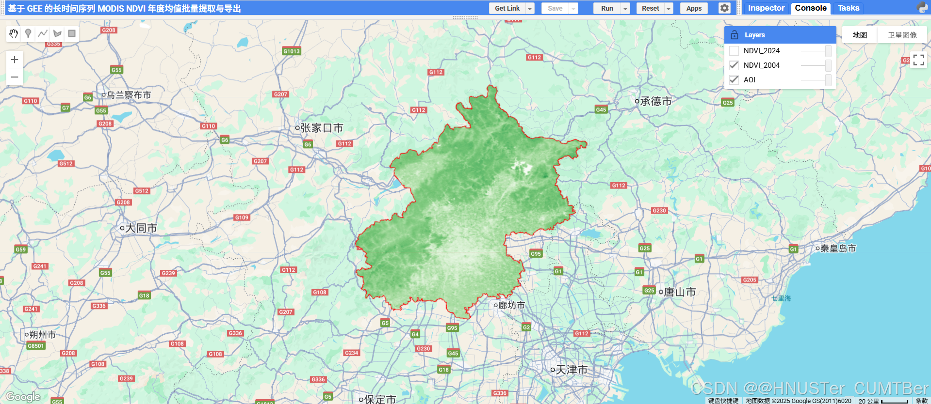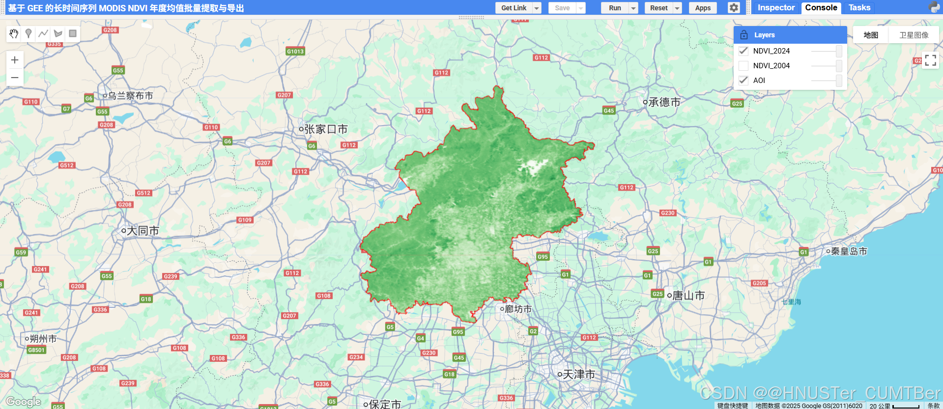 print('✅ 已创建 2004–2024 年度 NDVI 导出任务,请到 Tasks 面板运行。');