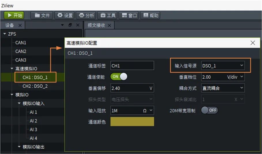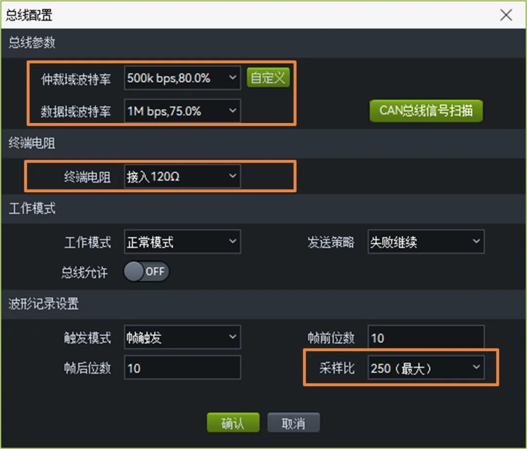 第二步,打开ZView软件,点开【CAN1】通道参数设置界面,设置波特率、采样点、终端电阻、工作模式及采样比等参数;