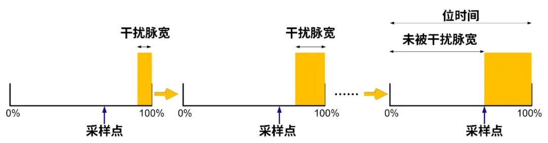 若无错误,按照选择的测量算法对应步进值逐步往前移动干扰脉宽,重复以上步骤,直到DUT发送错误帧为止,进而判断为采样点位置。