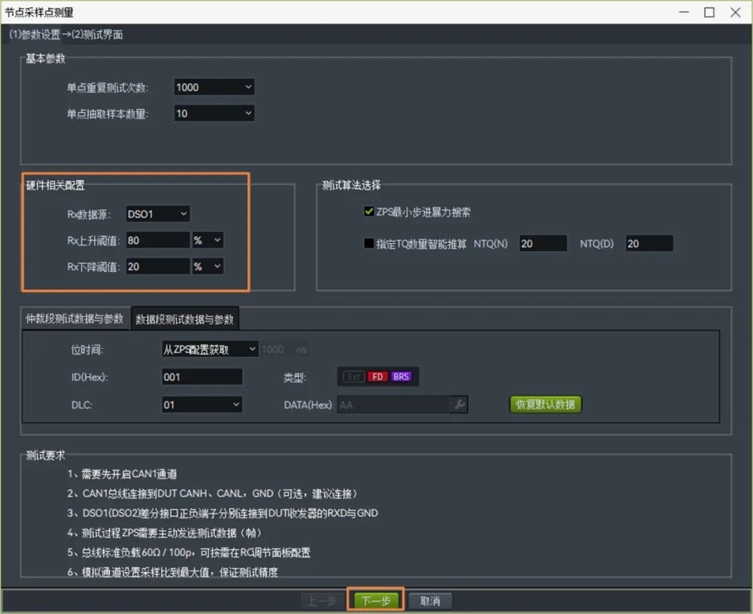 通过ZPS-CANFD的采样点测量功能对CAN/CAN FD网络上的各节点进行采样点测量,进而判断各节点的采样点是否设置一致。下面以实测某DUT采样点(仲裁域采样点为80%,数据域采样点为75%)的步骤为例,进行相关的介绍。
