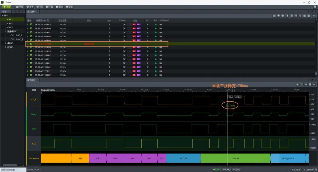 单击数据域采样点测试结果界面的最后一行数据,可关联到因干扰到DUT的采样点而报出错误的第一帧错误报文及对应的波形,然后在RX波形中找到干扰位,并测量其未被干扰脉宽为750ns,然后根据公式计算