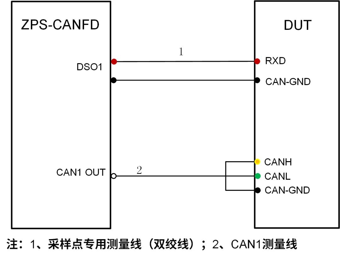 第一步,按照图 3连接方式,将DUT的RX、CAN信号分别和ZPS-CANFD的高速模拟通道DSO1、CAN1 OUT通道连接;