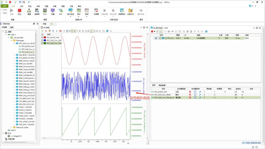 ZXDoc支持导入CAN、CAN FD解析文件DBC库和LIN解析文件LDF库(由于保密性,一般由主机厂或者Tier1持有),当对应通道总线收到DBC/LDF库所定义的底层报文后,软件会相应解析出实际物理值,且支持画出曲线,便于分析查看。
