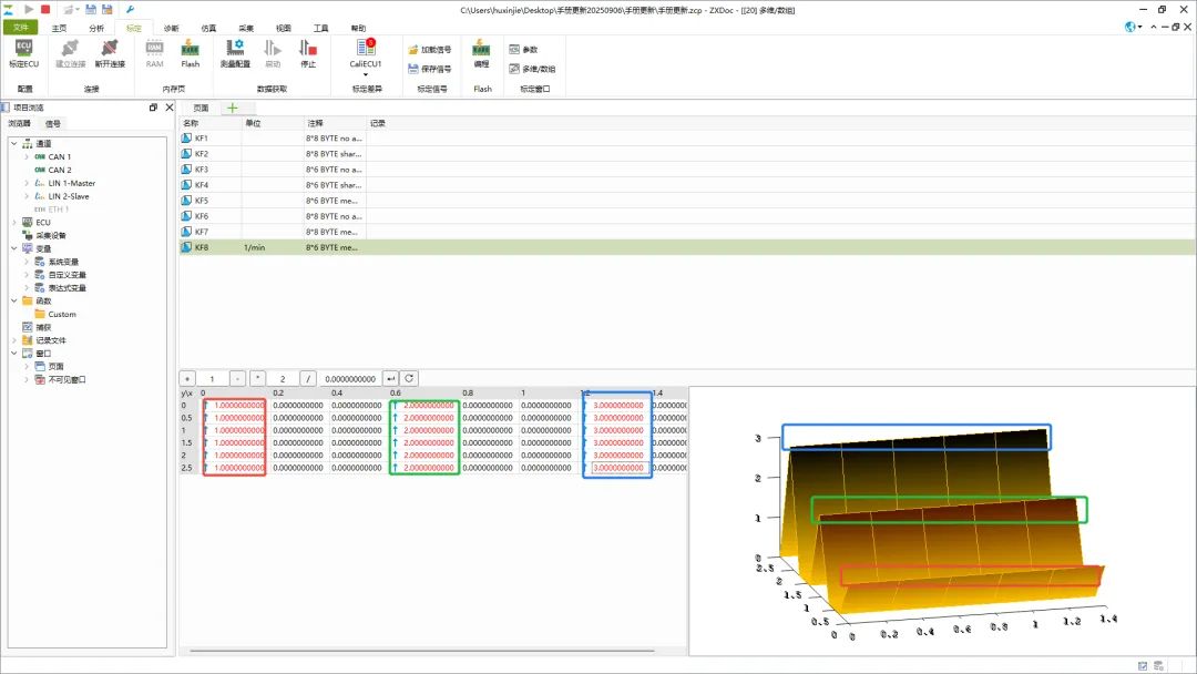 XCP/CCP标定(XCP-CAN、XCP-ETH、XCP-LIN、CCP)通过标准化协议实现参数高效调整与监测,提升标定精度与效率,支持跨ECU数据共享,加速控制策略优化与产品开发。ZXDoc支持加载A2L库,DAQ/Polling获取数据、通过参数/二维/多维方式进行标定,以线性、图形等多窗口显示标定结果。
