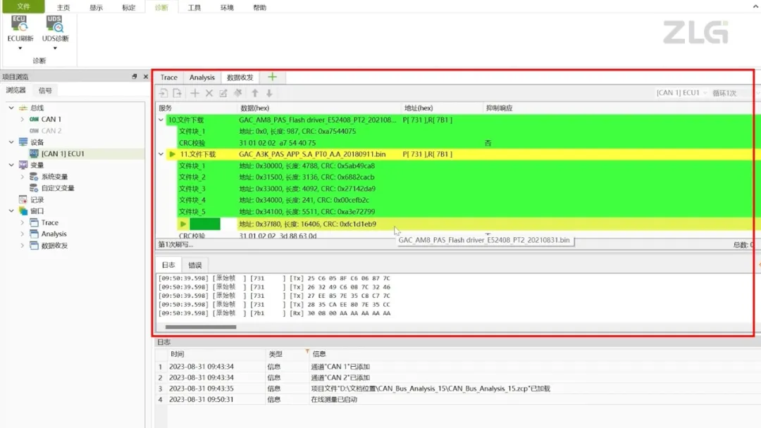 - 软件配置:启动ZXDoc上位机,初始化CAN0接口。若ECU处于自动上传数据状态,可在数据接收页面观察到持续报文。