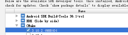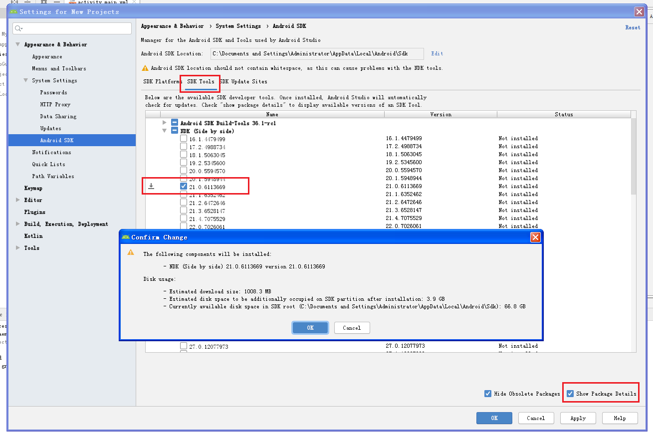 右边打开SDK Tools选项卡,把已安装的最新版NDK卸载了,勾选下面的Show Package Details,然后勾选安装NDK (Side by side) 21.0.6113669版本。