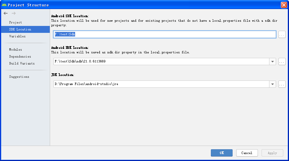 装完后,点击File -> Project Structure菜单,在SDK Location里面设置安卓SDK和NDK的路径。