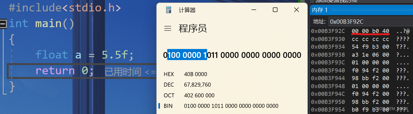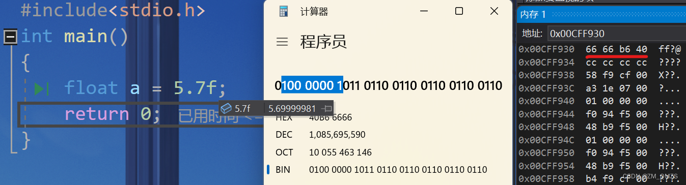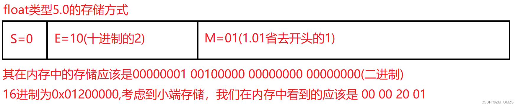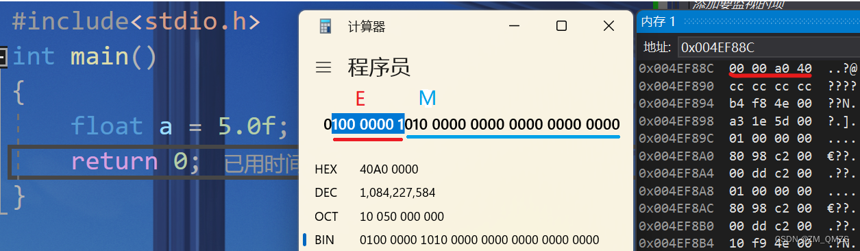 我们创建了一个float类型的变量a,值是5,但是在内存可以看到16进制是0x40a00000,转换成2进制是计算机上面的数字,可以看到第一个数字符号位S是0,M是前面两位存的是01,和之前的计算一样,但是红线画的是E不是10(十进制的2)而是10000001。