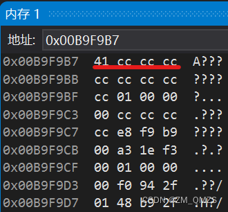 第二张图是变量ch在内存中的存储方式,因为字符A的ASCII码是65,而这里的值是16进制的41(char是占1字节也就是8bit位,16进制一个数字代表4位),换算成10进制就是65。