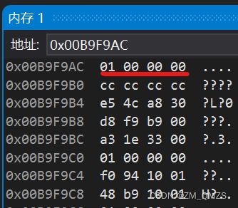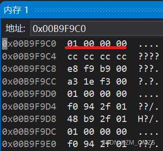 第一张图是变量a在内存中的存储方式,显示的是16进制的数字,值是00000001(int是占4字节也就是32bit位,16进制一个数字代表4位),是10进制的1。