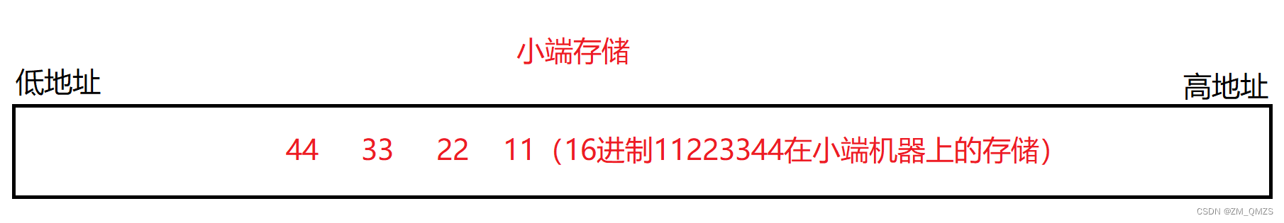 下图是16进制11223344数字在小端机器上内存中的存储,可见低位是存放在低地址,高位是存放在高地址,大端则相反。