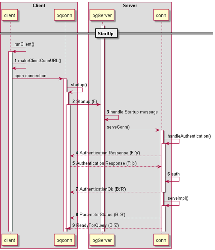 func(cn *conn) startup(o values){...for{// recevice responses after sending startupt, r := cn.recv()switch t {case'K':cn.processBackendKeyData(r)case'S':cn.processParameterStatus(r)case'R':cn.auth(r, o)case'Z':cn.processReadyForQuery(r)returndefault:errorf("unknown response forstartup: %q",t)}}}func(cn *conn) auth(r *readBuf, o values){switch code := r.int32(); code {case0:// OKcase3:w := cn.writeBuf('p')w.string(o["password"])cn.send(w)...case7:// GSSAPI, startup...w := cn.writeBuf('p')w.bytes(token)cn.send(w)...}}