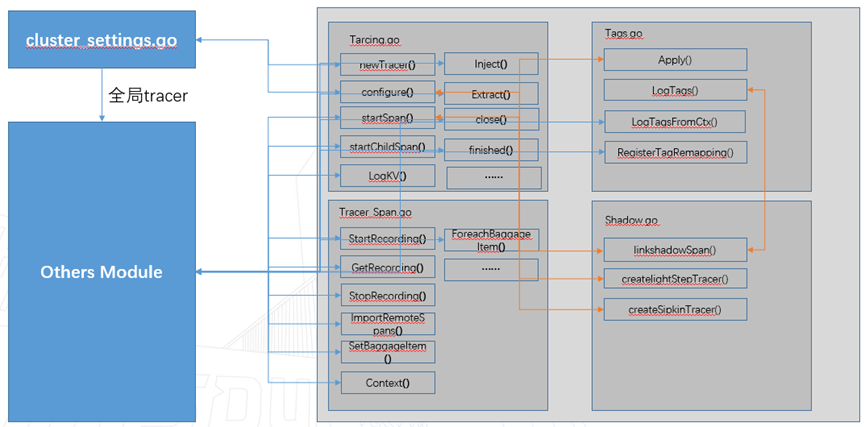 在cluster_settings.go中会创建tracer,供全局使用,其他模块中使用这个Tracer实现span的创建和其他操作,例如设定span名称、设定tag 、增加log等操作。