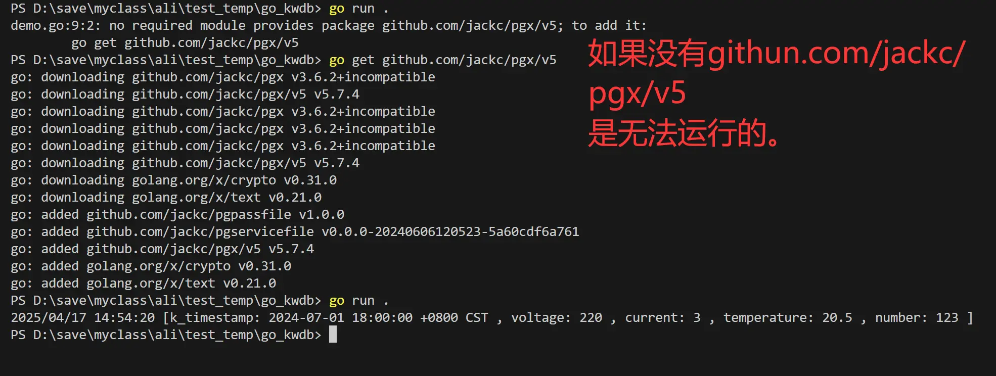 还需要下载:go get github.com/jackc/pgx/v5