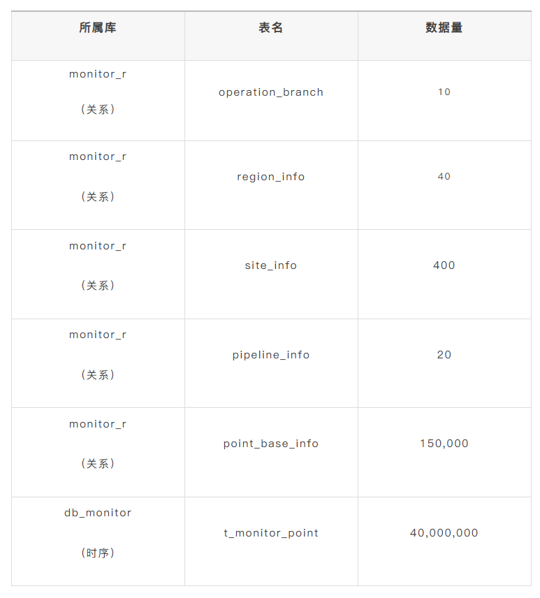 本次测试涉及的数据源包括关系型数据库和时序数据库,具体表结构与数据量如下: