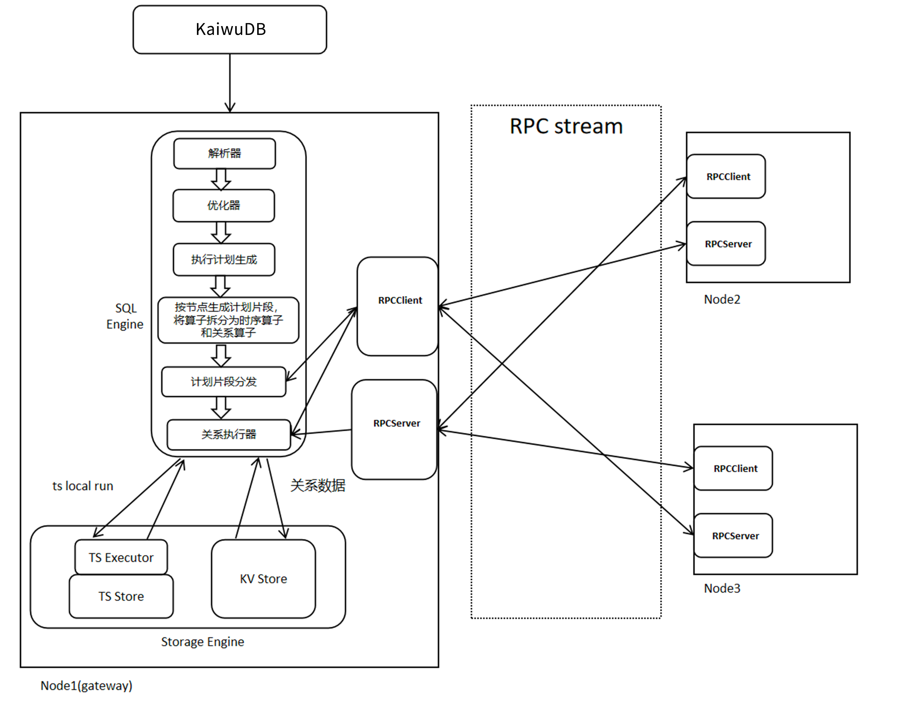 • 采用 RPC 作为统一通信协议,实现节点间(如 Node1 与 Node2/Node3)的执行计划分发、数据传输;