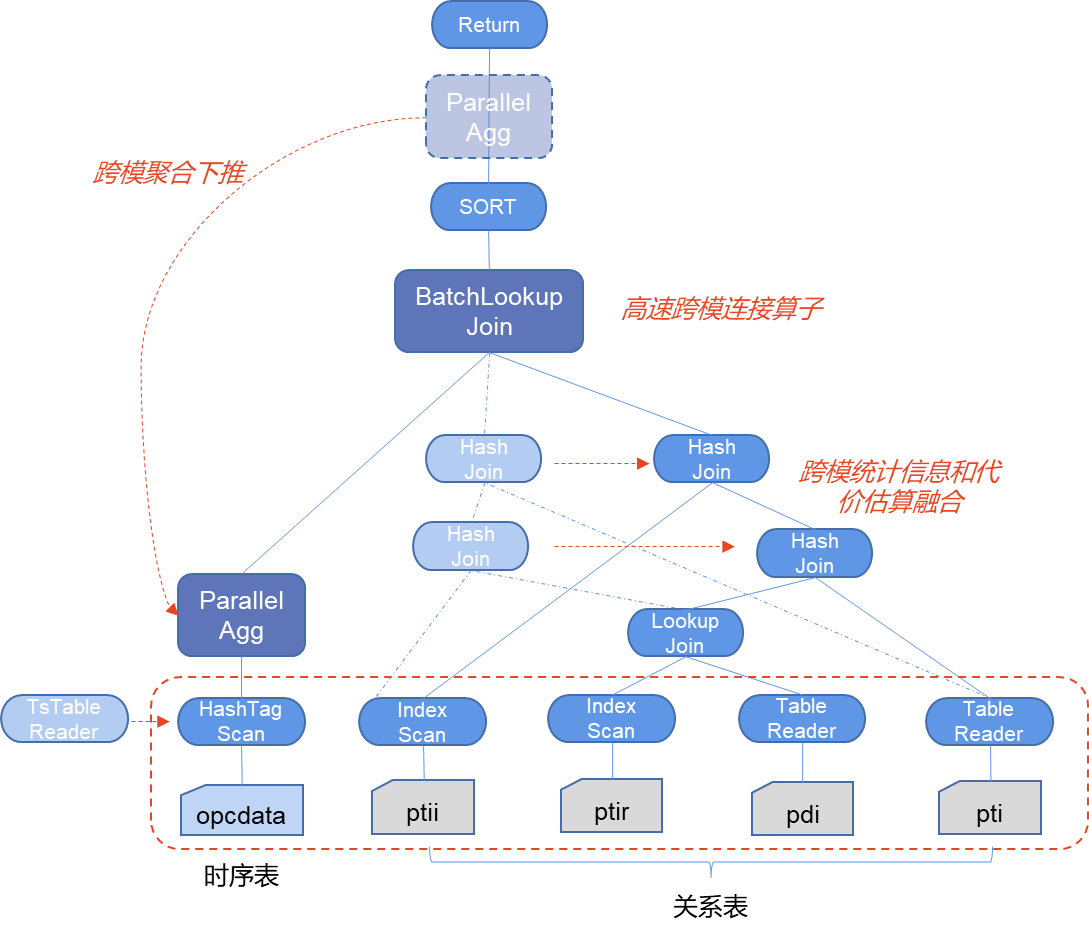 ① 先通过跨模统计信息和代价估算,选择最优的连接顺序,将两张时序表放到最后再与关系表,同时选择高速连接算子;