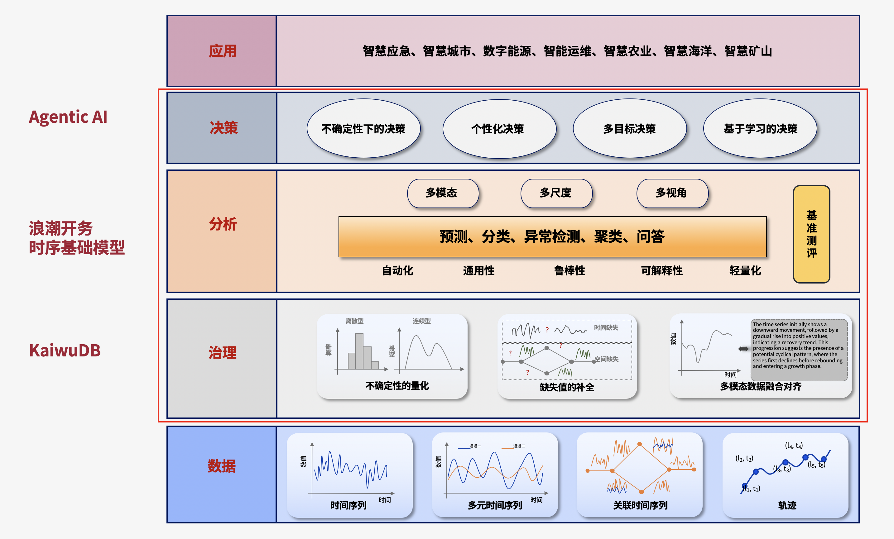 KaiwuDB 联合华东师范大学重磅推出的时序基础模型,以"治理-分析-决策"为核心框架,秉持AGREE(A utomation,G eneralization,R obustness,E xplainability,Efficiency)原则,为解决上述痛点提供了全新方案,推动时序智能走向大众化,助力物联网企业快速实现数智化转型。