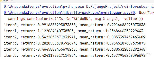 print(f'iter:{i}, return:{episode_return}, mean_return:{np.mean(return_list[-10:])}')