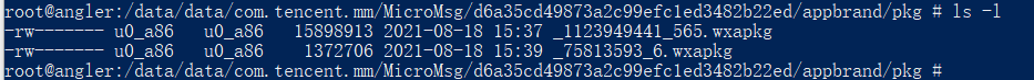 - 小程序的dex文件存放路径为/data/data/com.tencent.mm/MicroMsg/d6a35cd49873a2c99efc1ed3482b22ed/appbrand/pkg/,如图所示: