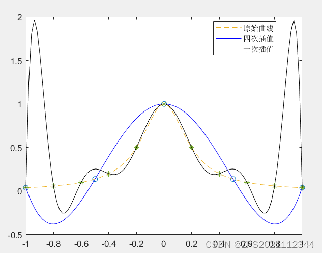 legend([pl1(3),pl1(2),pl2(2)],{'原始曲线','四次插值','十次插值'})