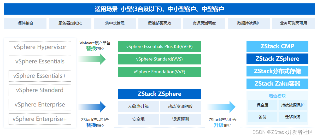 对于用户来讲,如何计算成本,如何衡量投入产出,成了复杂问题。那么订阅制对于用户到底意味着什么,云轴科技ZStack也来帮用户算笔账.针对不同VMware产品组合有各种替代路径,包括虚拟化平替,超融合替代,私有云替代升级等三种主要路径,ZStack产品矩阵可全面替代VMware数据中心核心产品线,产品组合可对标VMware四大订阅包。