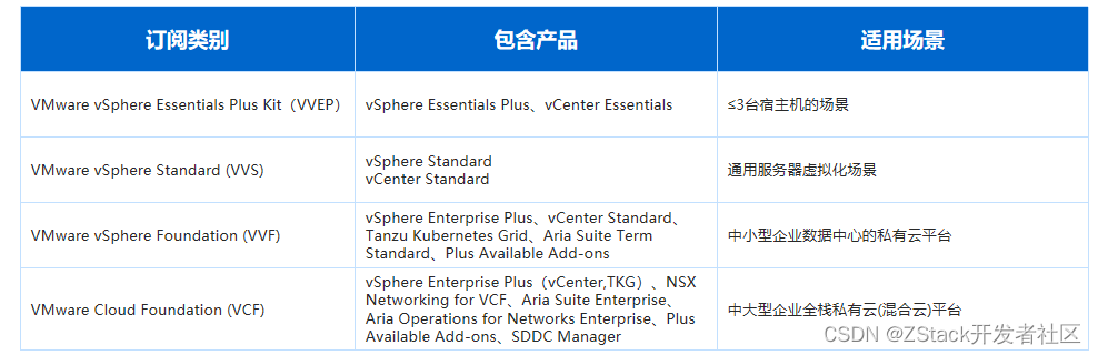VMware将各产品线改为以四大订阅包为基础的产品组合,从永久授权改为1/3/5年订阅,且订阅制后售卖规则也进行了调整,比如: