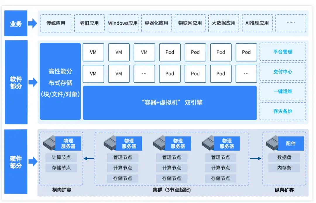 - 虚拟机+容器版:采用双引擎架构,可依据业务需求动态分配资源,提升利用率。容器直接部署在物理机上,既可减少虚拟机开销提升性能;又无需依赖虚拟化软件授权降低TCO;还降低系统架构复杂性,提升运维效率。