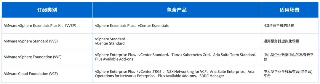 这里我们先为大家展示一下目前VMware不同的订阅包适用的场景,方便用户做对照,进而选择合适的替代方案。