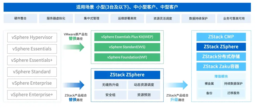 虚拟化平台ZSphere可以实现对VMware VVEP(小企业订阅包)、VVS包括+集中式存储)、VVF(包括+集中式存储)的100%替代,通过与CMP、集中式存储、分布式存储、容器产品形成升级路径,构建起替代产品组合方案。