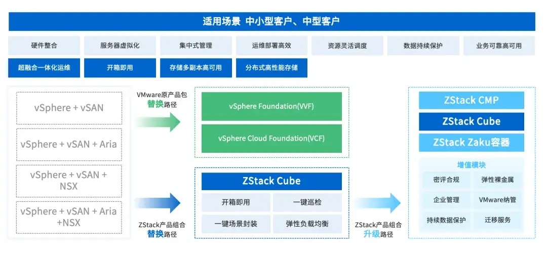 对于部分中小企业和中型企业用户,如果采用的是vSphere+vSAN或者vSphere+vSAN+NSX+Aria,VMware为这部分用户推荐的订阅包主要是VVF(vSphere Foundation)和VCF(vSphere Cloud Foundation)两种订阅包。如果这部分用户选择VMware替代方案,可以采用ZStack Cube超融合一体机。