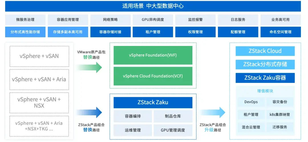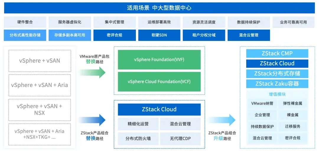 对于中大型数据中心用户,采用的是VMware vSphere+vSAN+网络、运维、容器等组件时,VMware给用户推荐的订阅包是VVF和VCF。如果这部分用户选择VMware替代方案,可以采用ZStack Cloud进行替代。