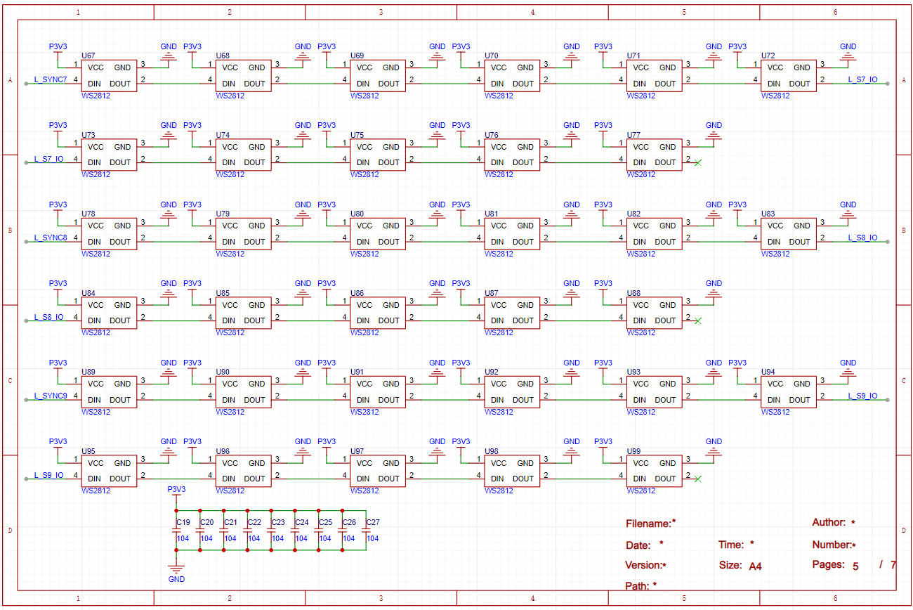 由于WS2812对电源纹波的高要求,每面加入多个100uF 电解+0.1uF 陶瓷滤波。其电路原理图如图2.7所示。